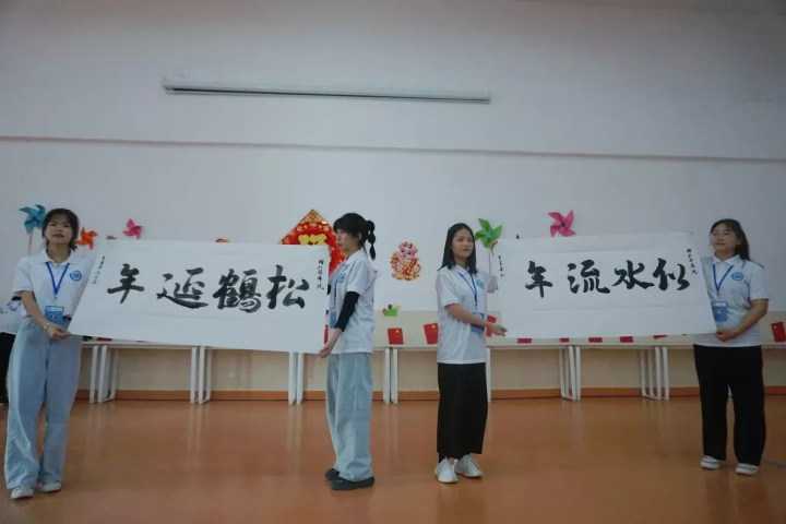 到达敬老院后由实践部干部带领学生会干事排队进入敬老院活动室,干事们陪老人们聊天逗乐,为老人们带来了舞蹈《美美哒》、歌曲《外婆的澎湖湾》《那些年你很冒险的梦》、手语操《国家》,以及学生会外联部部长为老人们送上书法“松鹤延年,似水流年”的祝福,最后所有干事以一首《千山万水》结束了此次敬老院文艺汇演。