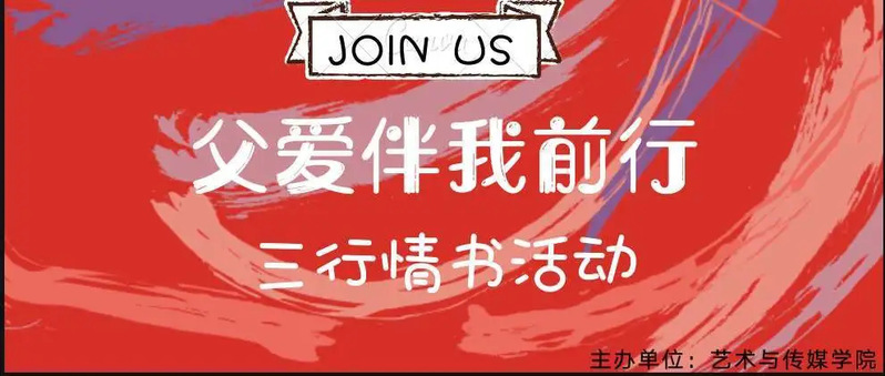 艺术与传媒学院推出以父爱伴我前行为主题的三行情书比赛。希望通过本次活动,培养学生对家庭、对父母、对亲人有热爱、有责任、愿奉献的良好情感,增强学生的道德规范素养。