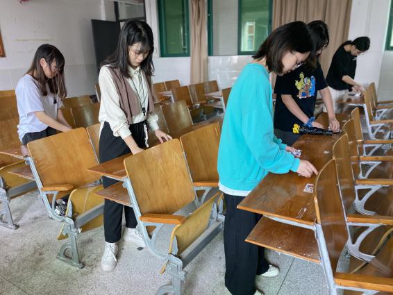 同学们集合完毕后,由党建小组成员的带领下进行了分组打扫,在图书馆3楼和西三4楼进行清理,不放过一丝污垢,将课桌上残留的广告清理干净。