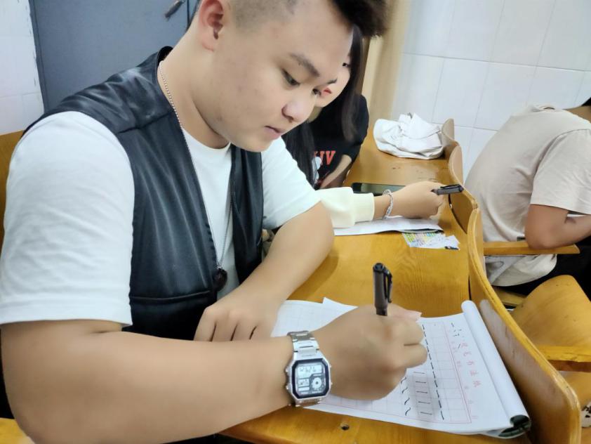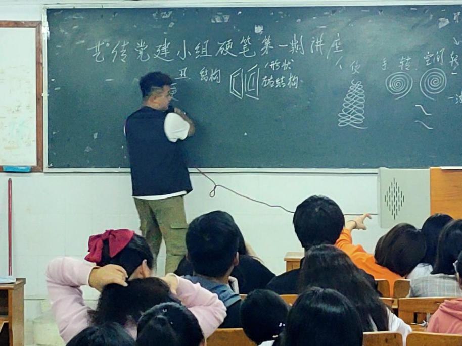 讲座开始由张召能队长教同学们基本笔画,在黑板上亲自示范详细讲述一个笔画的开头到结尾。想要练好书法,笔画的书写十分重要,除此之外对于控笔的要求也非常高。同学们在进行球类运动时会练出手臂的肌肉,这并不利于书法中的“软”的展现,但是队长有妙招!通过练习画类似于蚊香的曲线可以有效改善肌肉过硬的问题,从而达到更好的效果。字体的整体呈现还需要形状、方向、大小的配合,这几点缺一不可。
