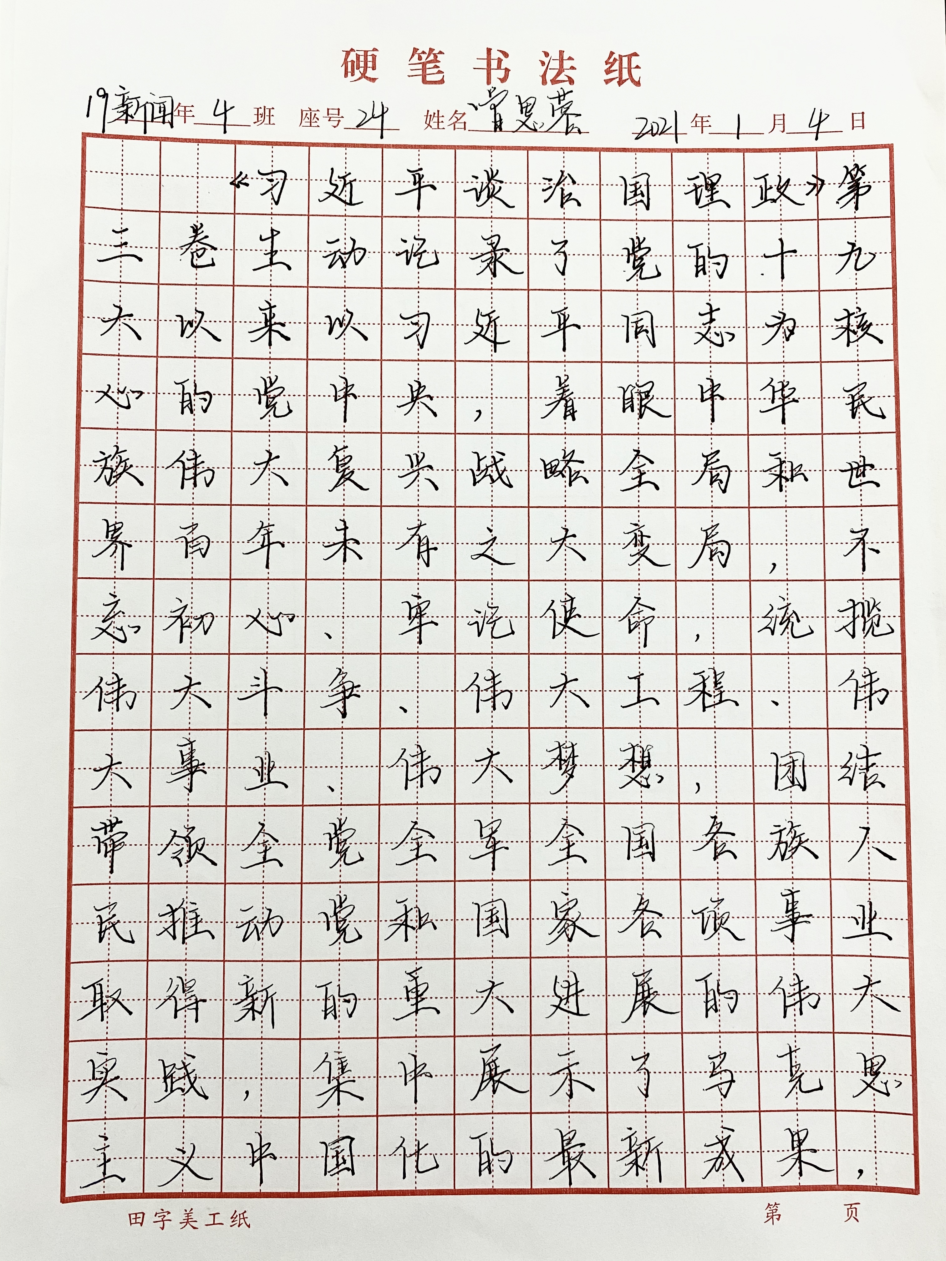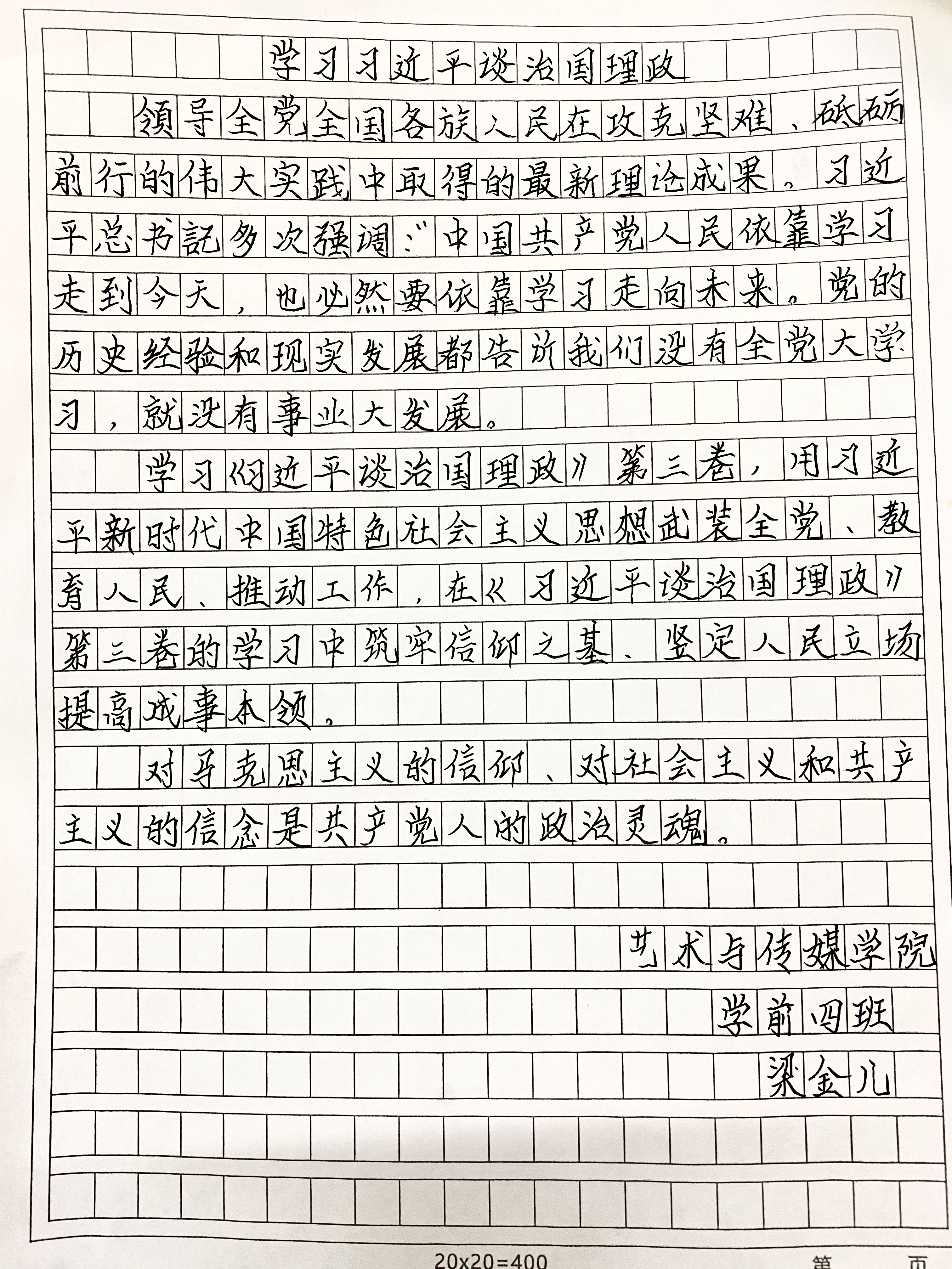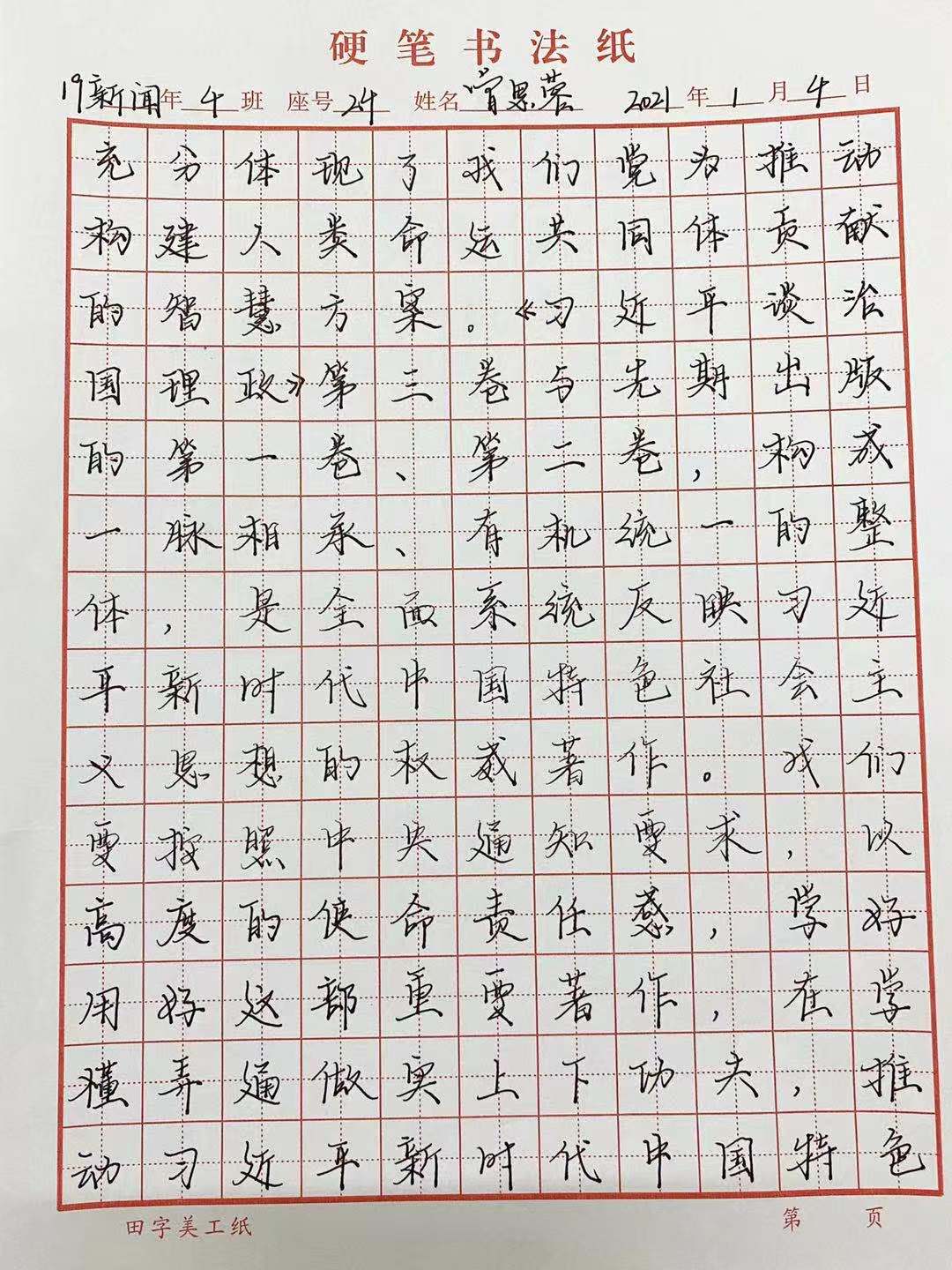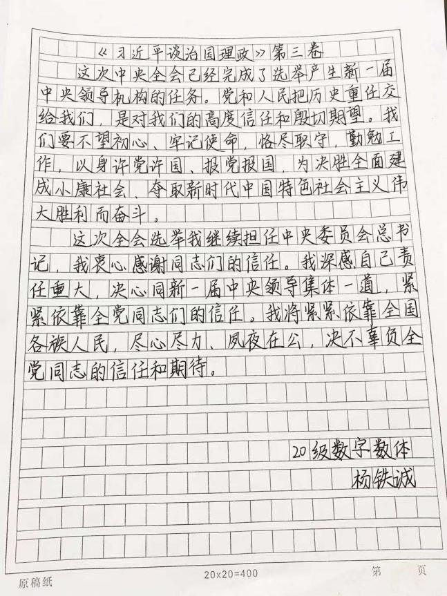 于2020年12月29日举行艺术与传媒学院第一届硬笔书法比赛。为了帮助同学们更加深入领会掌握习近平新时代中国特色社会主义思想的科学体系,进一步增强学思想、悟思想、用思想的自觉性和坚定性,将《学习习近平谈治国理政》第三卷的内容作为比赛的内容。