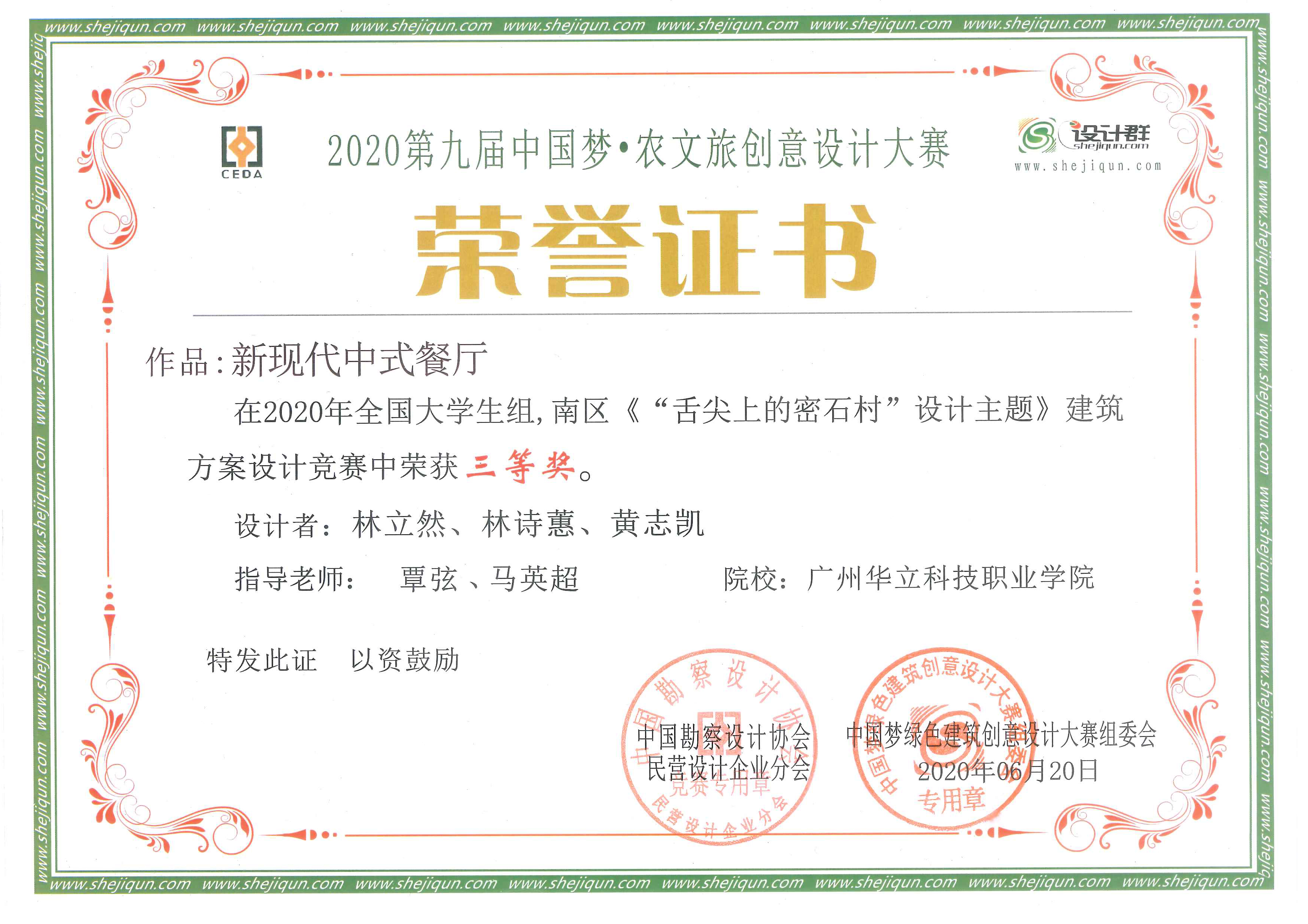 2020第九届中国梦·农文旅创意设计大赛获奖证书