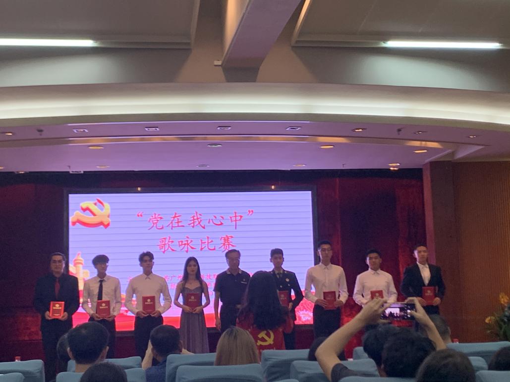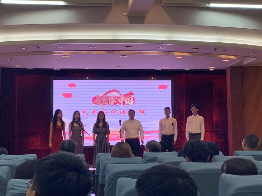 比赛开始,八大学院代表队按照顺序依次登场,每支代表队在表演过程中各出奇招,极具特色,一首首经典红歌在报告厅中响起,引起观众的共鸣。艺传学院代表队以一首《我爱你,中国》作为表演歌曲,曲声悠扬,荡气回肠,情真意切地唱出了对祖国、对党的真挚感情,现场气氛热烈,艺传学院代表队的表演多次获得了现场观众的掌声。评委老师们为各个代表队评分后,艺传学院代表队以最高分获得了本次比赛的第一名。随后,我校党委书记林伟健教授为各获奖学院代表队颁发荣誉证书并合影留念。