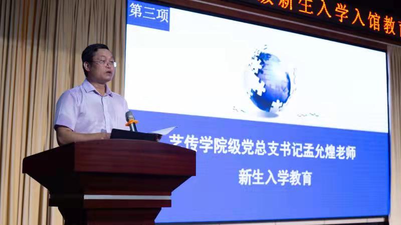 本次活动分为6个流程。首先,孟允煌副院长代表艺传学院全体教师对新同学表示热烈的欢迎,并从宏观和微观方面,对同学们提出期望与要求: