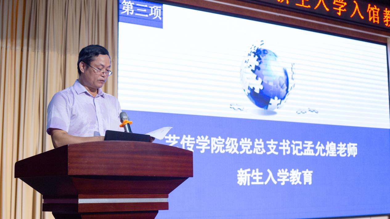 大会分为5个流程,首先由艺术与传媒学院党总支书记孟允煌院长发言,他表示非常高兴艺术与传媒学院又注入了新鲜血液,谨代表艺术与传媒学院全体教师对新同学表示热烈的欢迎,并从宏观和微观方面向同学们提出期望与要求,希望同学们不虚度三年的大学光阴。