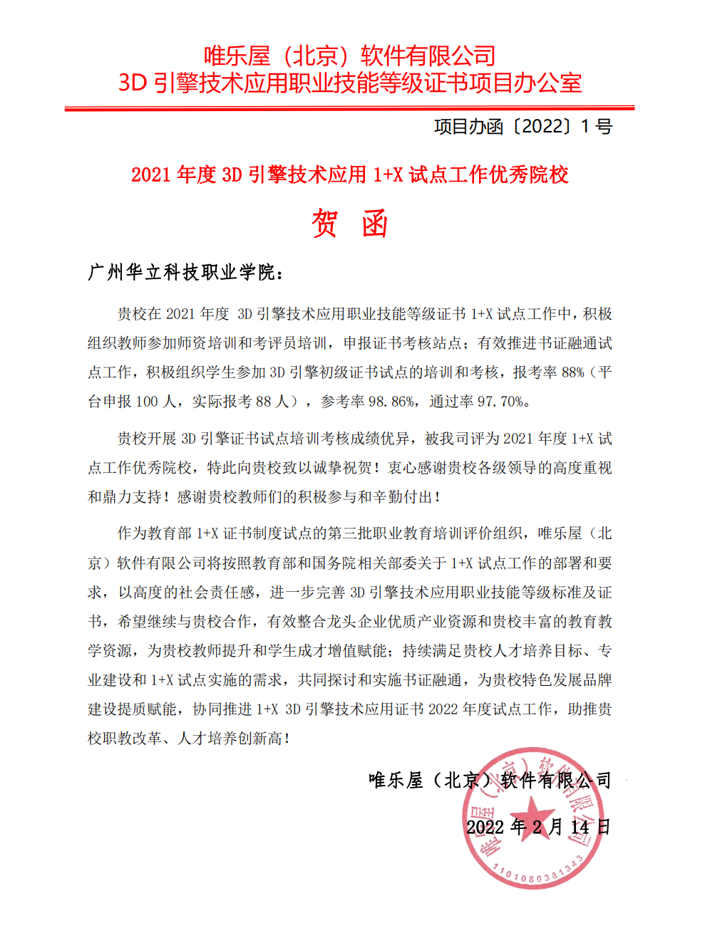 根据教育部、国务院相关部委和省教育厅关于1+X试点工作部署要求,在学校的领导下,我院在2021年度1+X 3D引擎技术应用职业技能等级证书试点建设工作中,积极组织师资培训和考评员培训,申报证书考核站点建设,有效推进书证融通试点工作,组织学生参加3D引擎技术初级证书试点的培训和考核。在2021年度1+X 3D引擎技术应用初级技能等级证书的考核中成绩优异,参加考试通过率为97.70%,得到教育部证书考核评价组织高度认可,获评为2021年度3D引擎技术应用1+X 试点工作优秀院校。