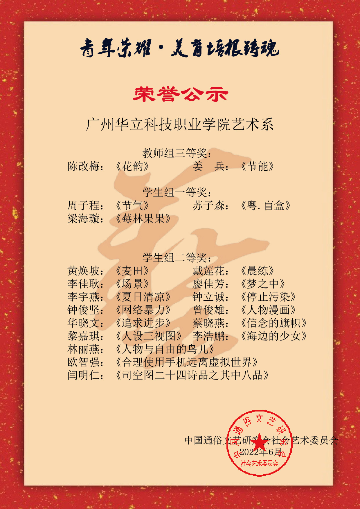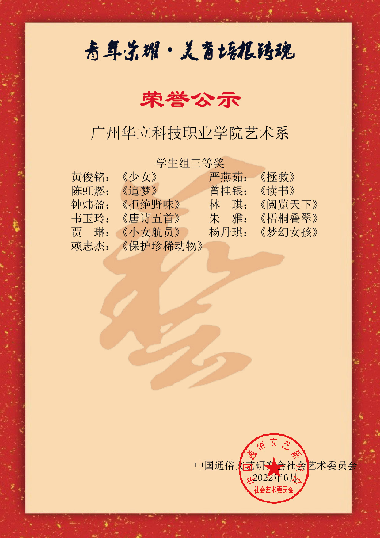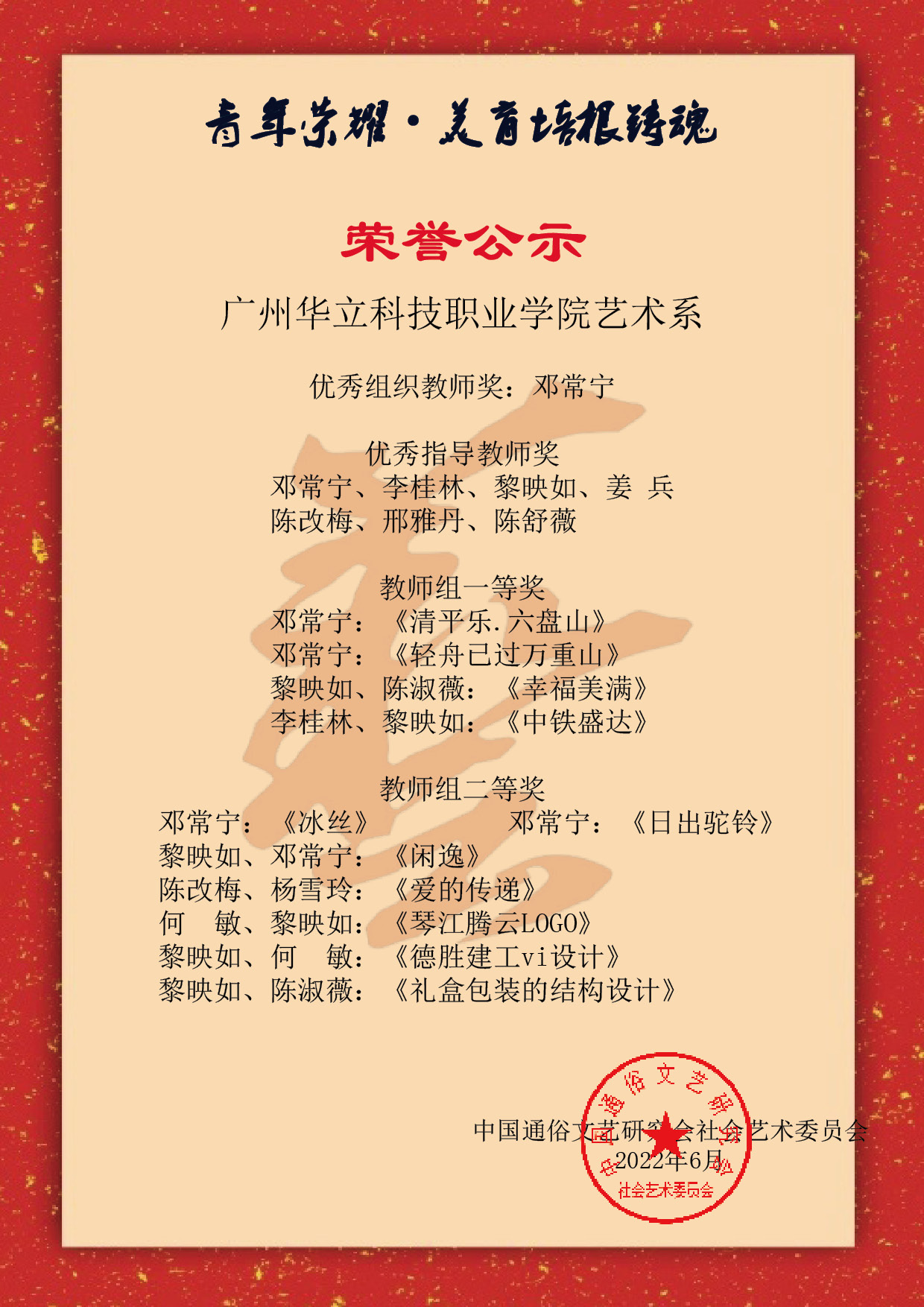 由中国通俗文艺研究会艺术委员会举办的第二届全国“青年荣耀.美育培根铸魂”青少年艺术成果展演比赛活动中,我院教师、学生获得优异成绩,在这次大赛活动中,我院邓常宁、李桂林、邢雅丹、黎映如、姜兵、陈改梅、陈舒薇老师获得优秀指导老师奖,以上老师分别荣获教师组一、二、三等奖。我院29名学生获得优异成绩。