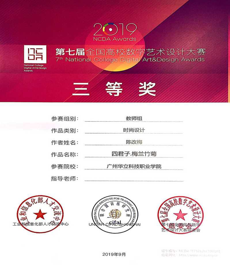 2019年陈改梅老师作品四君子 梅兰竹菊荣获第七届全国高校数字艺术设计大赛三等奖