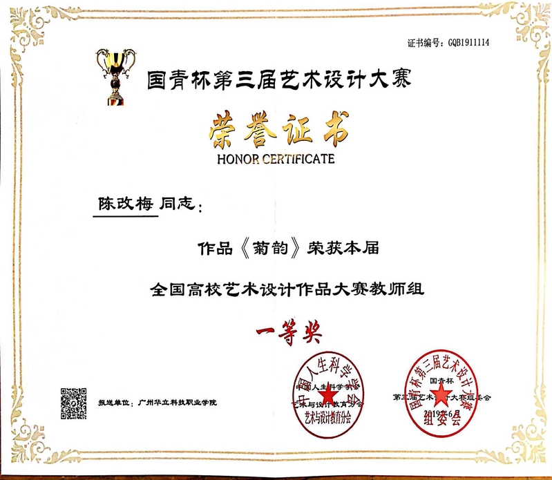 2019年陈改梅老师作品《菊韵》荣获国青杯第三届全国高校艺术设计大赛一等奖
