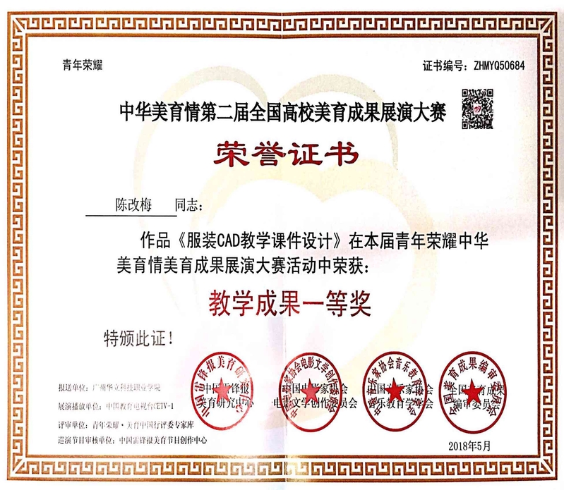 2018年陈改梅老师获第二届“国青杯”全国高校艺术与设计作品展评教学成果一等奖