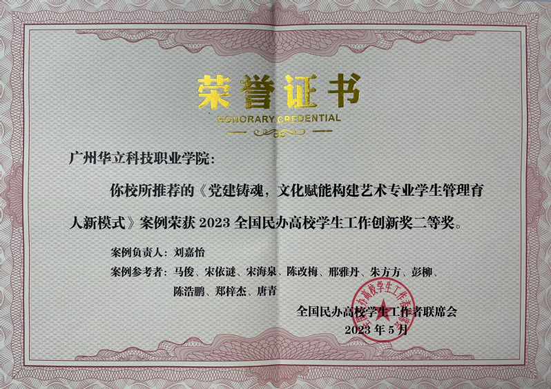 在本届研讨会中,我校学工团队研究成果丰硕,获得多项荣誉,其中我院学管负责人刘嘉怡老师主持的案例《党建铸魂,文化赋能构建艺术专业学生管理育人新模式》荣获2023全国民办高校学生工作创新奖二等奖。