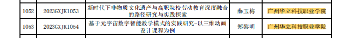 近日,广东省教育科学规划领导小组办公室发布了2023年度教育科学规划课题(高等教育专项)立项名单,其中我院邢雅丹老师申报的《以绿美广东生态建设为引领,高职院校构建数字艺术赋能乡村振兴的路径研究》项目、郑黎明老师申报的《基于元宇宙数字智能教学模式的实践研究-以三维动画设计课程为例》项目成功立项。