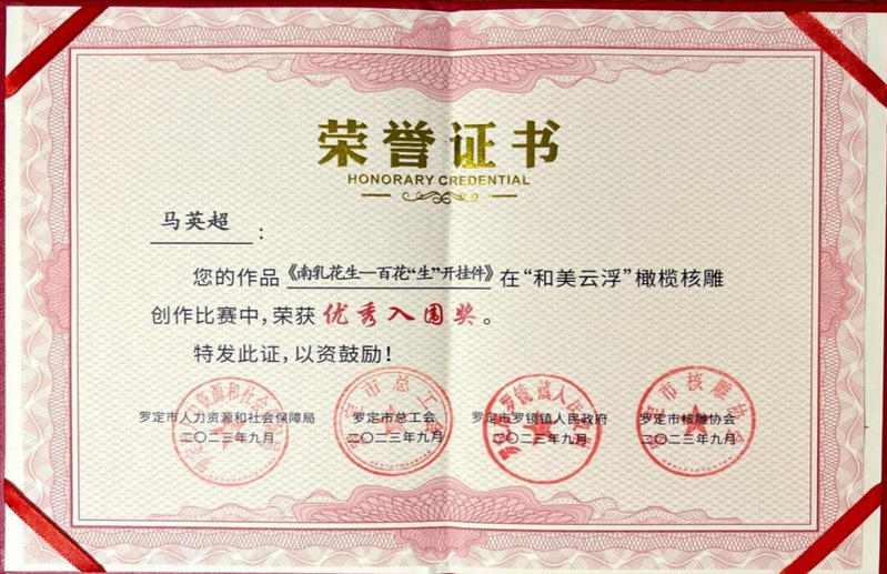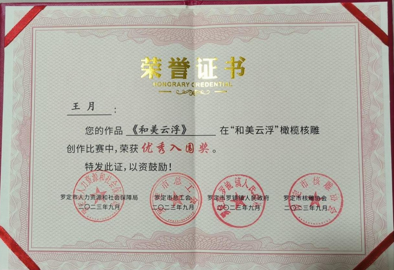 “和美云浮”橄榄核雕大赛,由云浮市文学艺术界联合会指导,罗定市人力资源和社会保障局、罗定市总工会、罗定市罗镜镇人民政府、罗定市核雕协会、云浮市民间文艺家协会联合主办。大赛参照工艺品雕刻工国家职业技能高级工标准,以体现橄榄核雕艺术特点、兼具实用性、观赏性和展示性为原则。大赛考量创作者的主题思想把握、核雕艺术特色、工艺手法技巧、艺术创意水平、形象空间美感等。自“和美云浮”橄榄核雕创作比赛启动以来,得到来自:吉林、广州、韶关、番禺和云浮市、罗定等广大核雕创作艺人的积极响应和广泛参与,经过1个多月的预赛和决赛比拼,9月24日,在“庆丰收促和美”—2023 广东云浮·罗定稻米金香暨第二届橄榄核雕文化活动启动仪式上,公布了结果并举行颁奖仪式。