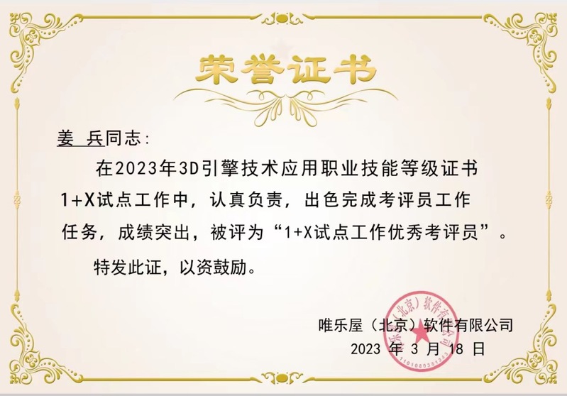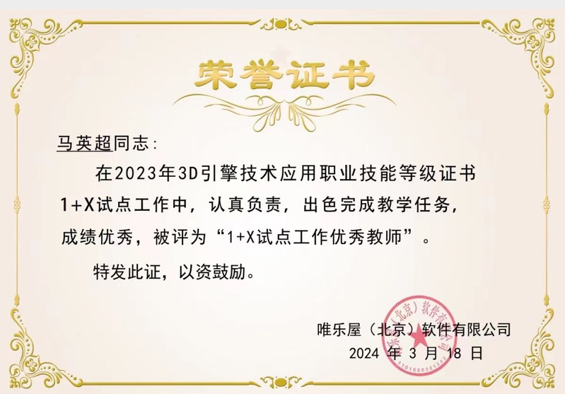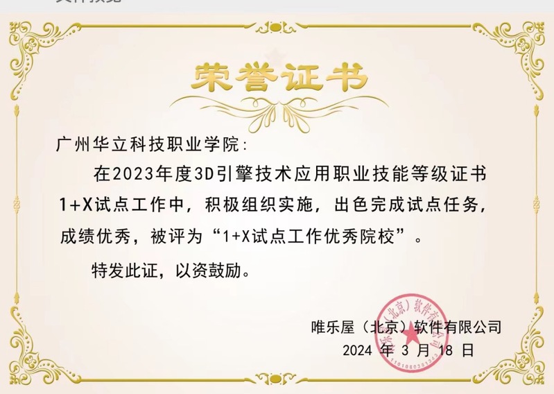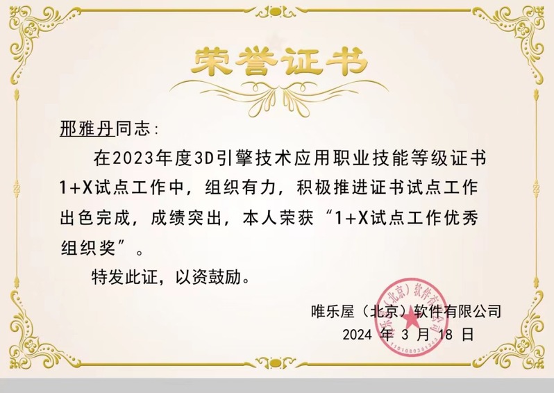 2024年3月18日,艺术与传媒学院在国家指定1+X职业院校职业证书认证单位唯乐屋年度表彰大会上获得“1+X试点工作优秀院校”、“优秀组织奖”、“优秀教师”、“优秀考评员”奖项。