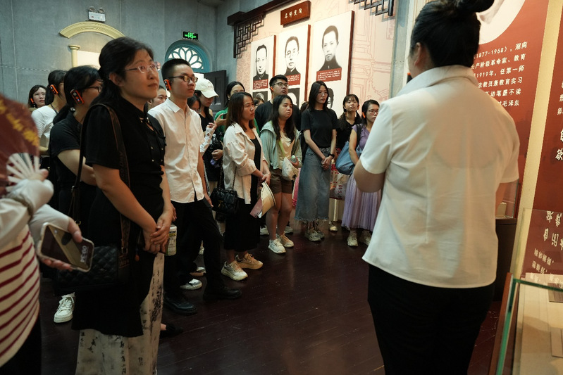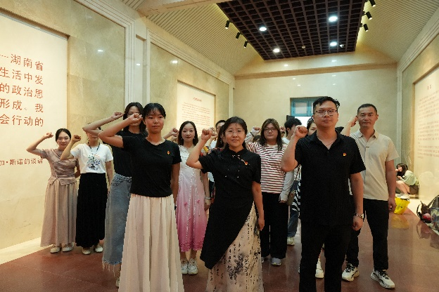 在纪念馆,沿着习近平总书记今年3月考察湖南一师的足迹,党员们参观了第一师范学校大礼堂、第八班教室、第八班寝室、水井等纪念地和陈列展厅。通过聆听讲解员“名师熏陶师德师风——跟毛泽东学尊师敬友” “光缆天下群书,常新胸中日月——跟毛泽东学读书”两个主题的讲解,党员们了解了青年毛泽东在此求学、执教以及从事早期革命活动的情况,现场感悟一代伟人及革命前辈们探求人生真理,自觉投身革命事业,为民族独立、人民解放和国家富强不懈奋斗的崇高精神和家国情怀。