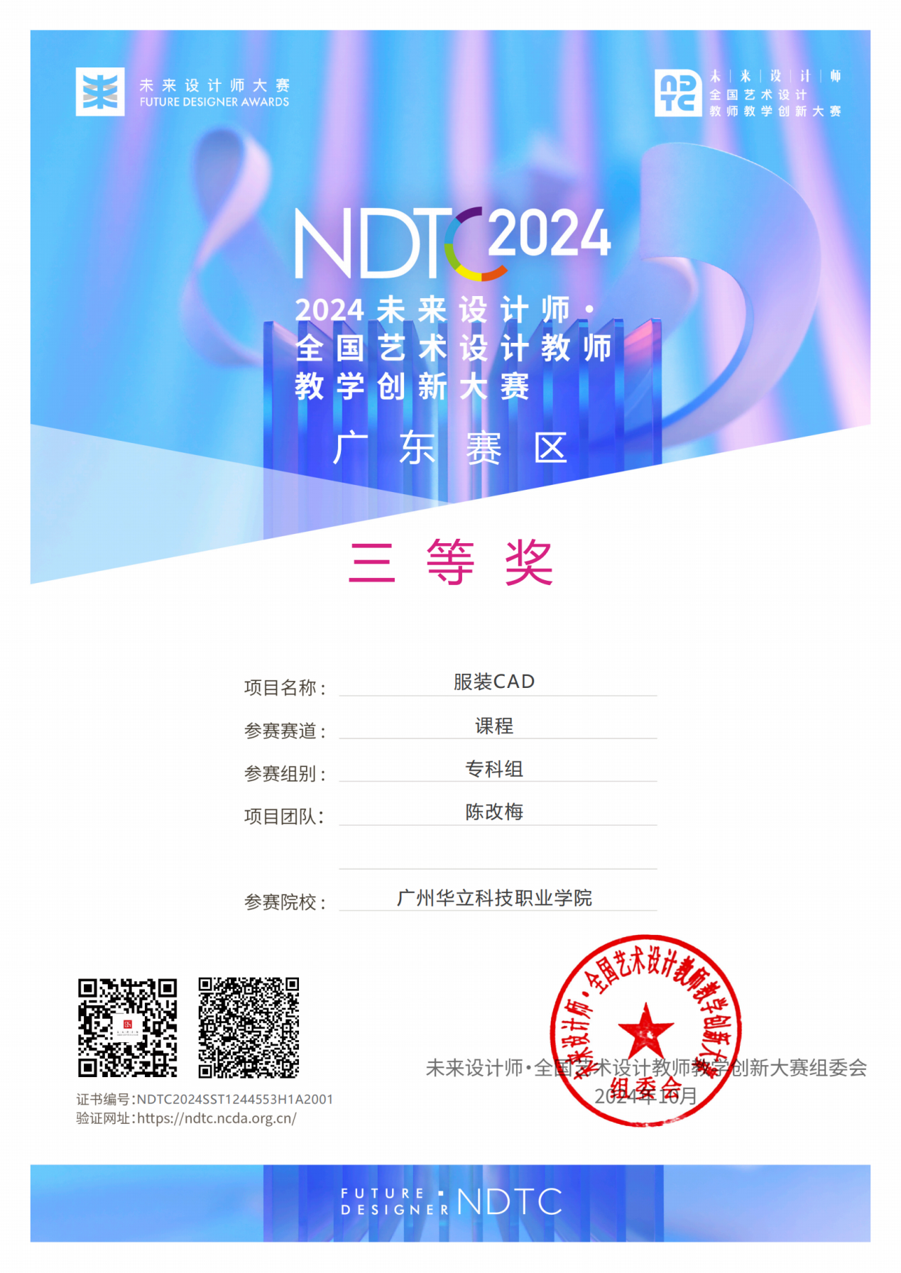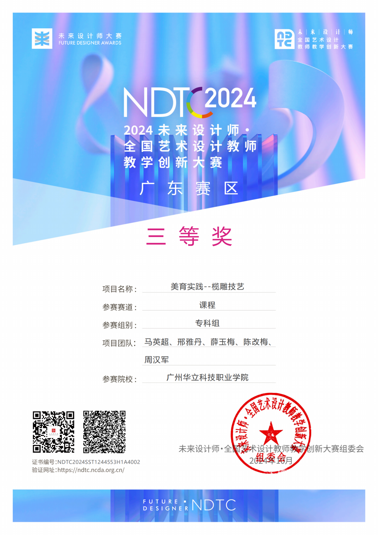 其中,陈改梅老师凭借《服装CAD》课程荣获大赛三等奖。该课程以其独特的教学设计、丰富的教学内容和创新的教学方法,获得了评审专家的高度评价;李桂林老师及团队凭借课程《基于岗课赛证创背景下PS图像处理课程建设》荣获大赛三等奖,课程巧妙地将理论与实践相结合,通过引导学生参与实际项目,培养了学生的创新思维和实际操作能力;马英超老师及团队凭借课程《美育实践--榄雕技艺》荣获大赛三等奖,课程采用了项目式学习,极大地激发了学生的学习兴趣和主动性。