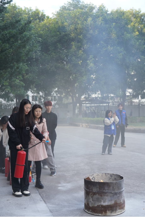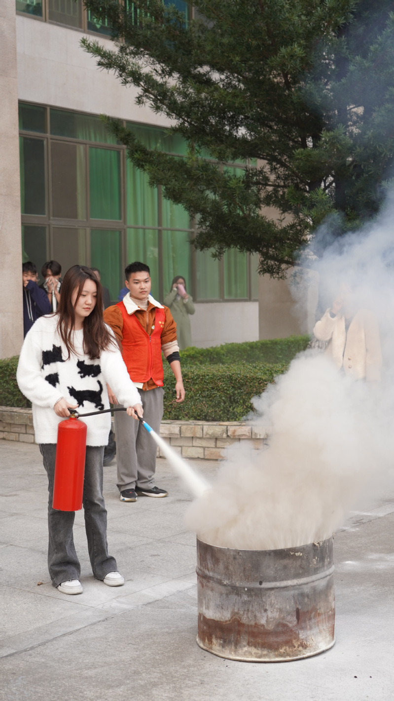 艺传学院党总支书记陈改梅带头演练灭火并手把手指导学生操作