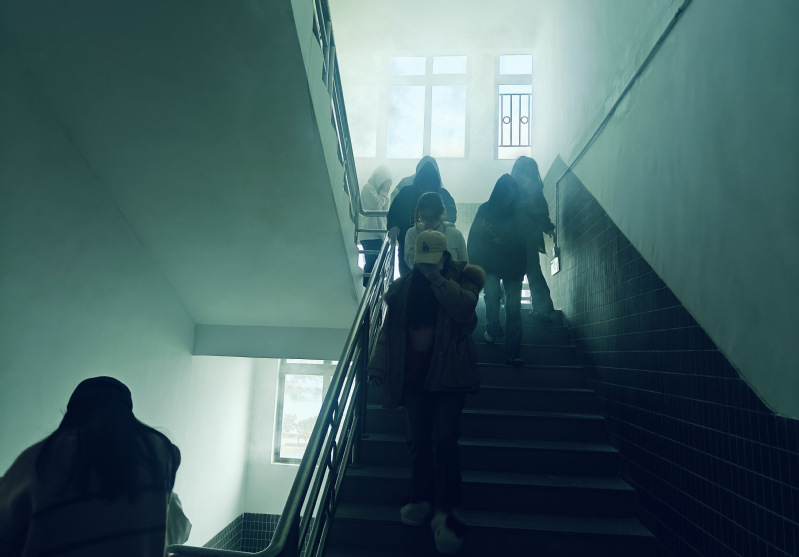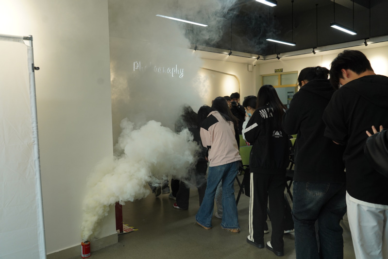 模拟场景二:灯罩冒烟着火演练;教师正在进行摄影灯罩的教学,学生发现实训室中摄影棚某个灯罩冒烟并冒火星,学生通知任课老师,任课老师立即判断火势大小,并大声呼叫示警。任课老师指挥学生保持冷静,按照疏散路线有序撤离(从门口疏散,就近楼梯),防止发生踩踏事件。教导学生在疏散过程中,保持弯腰低姿,用衣服或者毛巾等湿润物品捂住口鼻,防止吸入有毒烟雾,走楼梯下到一楼安全地点集合清点人数。