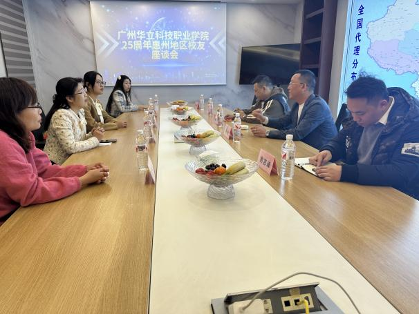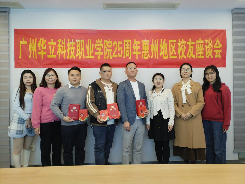 2024年12月28日,广州华立科技职业学院成立25周年之际,为充分发挥校友智慧,凝聚校友力量,在惠州市惠城区惠鹏大厦召开校友座谈会并成立惠州分会成立大会。参加此次座谈会的有艺术与传媒学院党总支书记陈改梅、就业主任黎映如、学管主任刘嘉怡、骨干教师吴玉娴和谢瑞祥,以及惠州地区部分校友。
