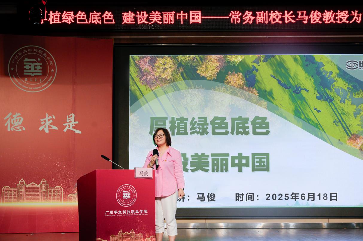 为深入贯彻落实习近平生态文明思想,2025年6月18日晚上6点在图书馆八楼礼堂,广州华立科技职业学院常务副校长马俊教授以“厚植绿色底色 建设美丽中国”为主题,为艺术与传媒学院师生带来了一堂别开生面、意义深远的思政课。参加此次思政课的有艺传学院院长朱君、全体辅导员、专业老师以及23级400左右学生,艺传学院党总支书记陈改梅主持。