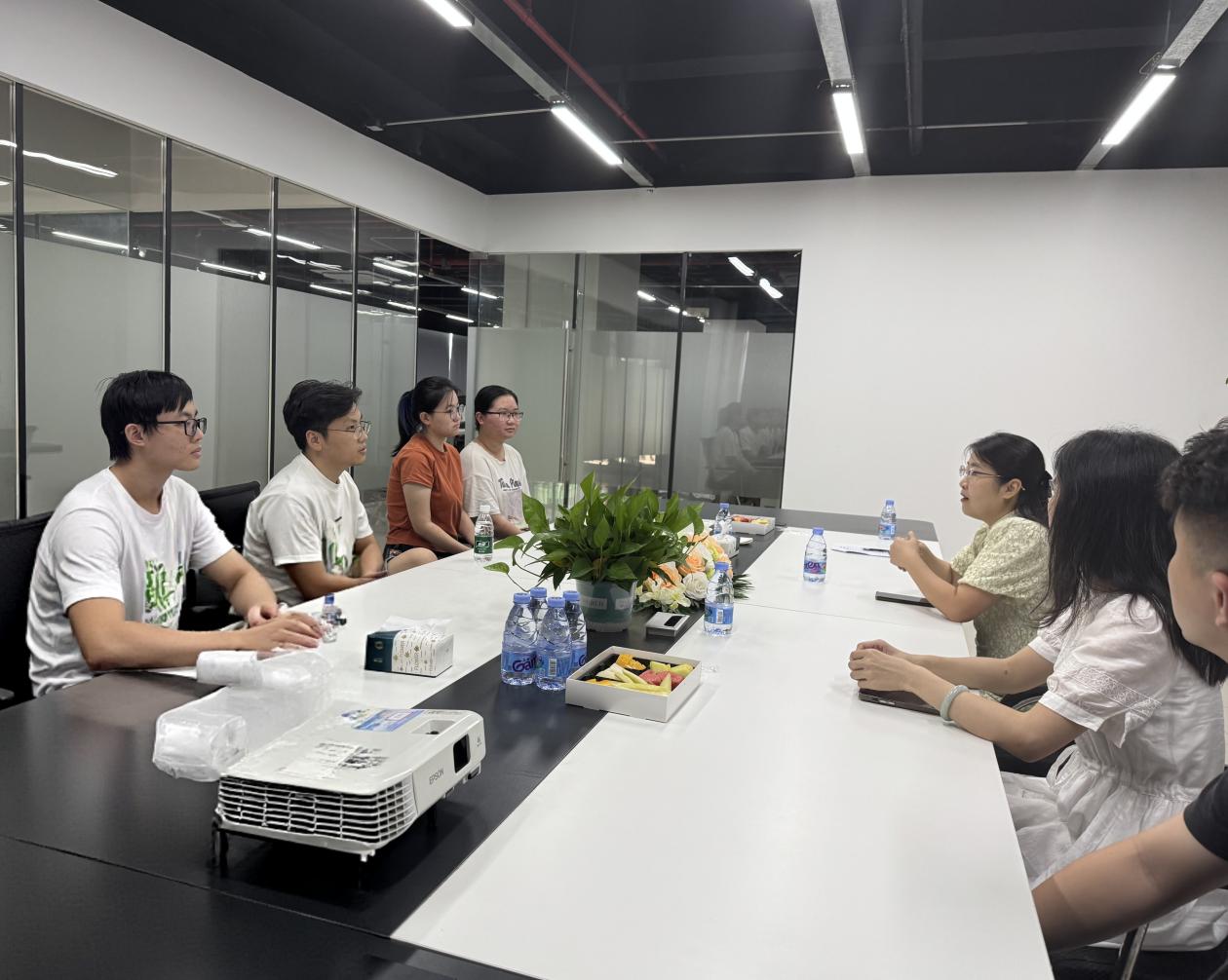 广州鼎艺网络科技有限公司 CEO 胡梦滔与人事部经理杨敏对学院一行的到来表示热烈的欢迎,并与我院开展座谈交流,陈改梅书记与学生们亲切交流,细致询问了他们的工作内容、生活情况以及实习收获,提醒学生在外提高安全意识和防诈警惕,并鼓励大家积极适应企业环境,将校内所学有效运用于实践,不断提升专业能力和创新意识。