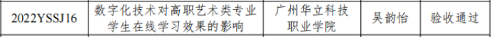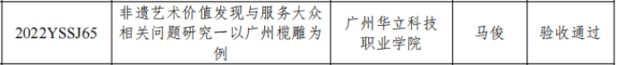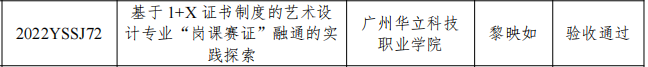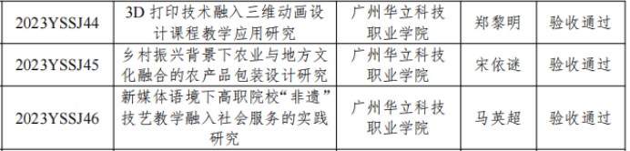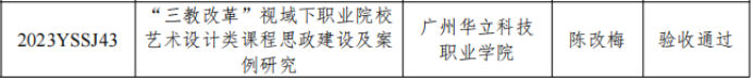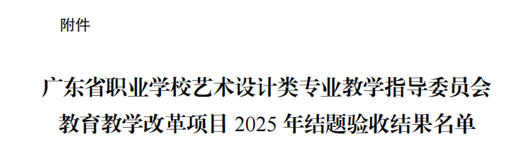 近日,依据广东省职业学校艺术设计类专业教学指导委员会发布的《广东省职业学校艺术设计类专业教学指导委员会2022-2023年度教育教学改革项目2025年结题验收结果的通知》(粤职艺术设计教指委〔2025〕5号),我校传来喜讯:由马俊教授主持的《非遗艺术价值发现与服务大众相关问题研究——以广州榄雕为例》(项目编号:2022YSSJ65)、吴韵怡副教授主持的《数字化技术对高职艺术类专业学生在线学习效果的影响》(项目编号:2022YSSJ16)、黎映如副教授主持的《基于1+X证书制度的艺术设计专业“岗课赛证”融通的实践探索》(项目编号:2022YSSJ72)、陈改梅副教授主持的《“三教改革”视域下职业院校艺术设计类课程思政建设及案例研究》(项目编号:2023YSSJ43)、郑黎明副教授主持的《3D打印技术融入三维动画设计课程教学应用研究》(项目编号:2023YSSJ44)、宋依谜副教授主持的《乡村振兴背景下农业与地方文化融合的农产品包装设计研究》(项目编号:2023YSSJ45)、马英超副教授主持的《新媒体语境下高职院校“非遗”技艺教学融入社会服务的实践研究》(项目编号:2023YSSJ46)这7项教育教学改革项目均圆满通过结题验收。广州华立科技职业学院在此次教改浪潮中斩获丰硕成果,在数字化教学、非遗传承、产教融合等多个关键领域交出了一份令人眼前一亮的创新答卷,为艺术设计类职业教育的高质量发展注入了源源不断的强劲动力。