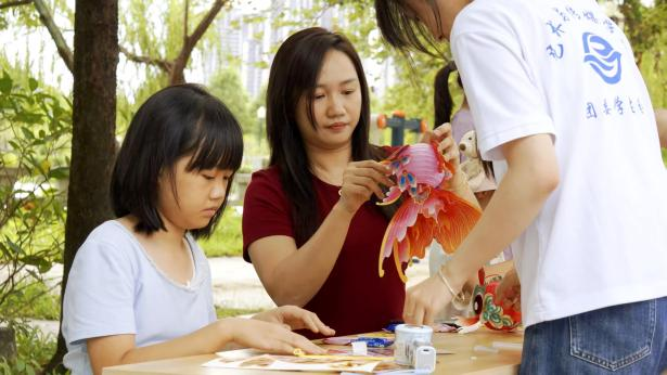 村民们在非遗体验区亲手尝试双节彩扎鱼灯,让指尖触碰传统技艺的温度;在互动游戏中猜灯谜,让欢笑装点团圆的时光。志愿者手把手教学的同时,穿插讲解“非遗中的红色故事”,将文化传承与党建教育巧妙结合。这些活动背后,是“政校企农”协同创新理念的实践,更是高校对“以文化人、以美育人”的践行。