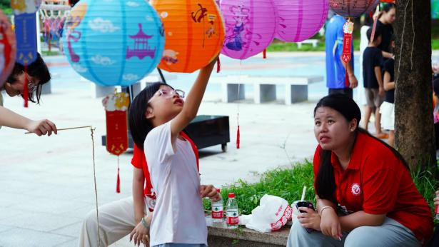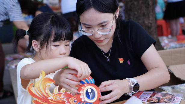 村民们在非遗体验区亲手尝试双节彩扎鱼灯,让指尖触碰传统技艺的温度;在互动游戏中猜灯谜,让欢笑装点团圆的时光。志愿者手把手教学的同时,穿插讲解“非遗中的红色故事”,将文化传承与党建教育巧妙结合。这些活动背后,是“政校企农”协同创新理念的实践,更是高校对“以文化人、以美育人”的践行。
