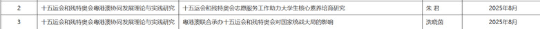 2025年8月,《十五运会和残特奥会粤港澳协同发展理论与实践研究项目》立项名单公布,学院朱君老师的《十五运会志愿服务助力大学生核心素养培育研究》、冼晓茵老师的《粤港澳联合办赛对国家统战大局的影响》两项课题成功获批。2025年10月,省教育厅青年创新人才类项目立项中,学院刘嘉怡老师的《数字媒体驱动下非遗剪纸跨维度再造与创新表达研究》成功获批。