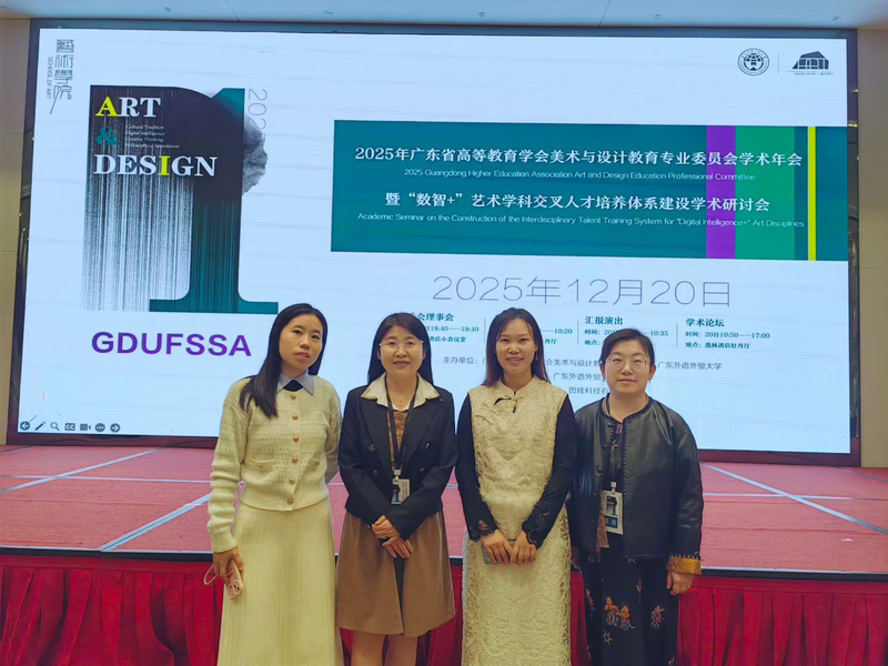 2025年12月19日至20日,广东省高等教育学会美术与设计教育专业委员会学术年会暨“数智+艺术学科交叉人才培养体系建设”高峰论坛在广东外语外贸大学成功举办。我校艺术与传媒学院陈改梅、马英超、邢雅丹、陈茜四位教师受邀参会,与来自全省70余所高校的近200名专家学者及行业代表共聚一堂,共话人工智能与数字经济时代艺术教育的变革与未来。