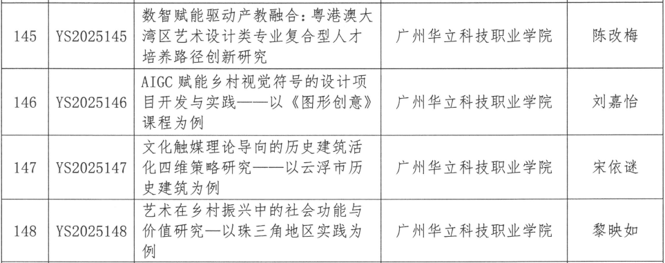 近日,广东省职业学校艺术设计类专业教学指导委员会公布了2025年教育教学改革研究与实践项目立项名单。我校艺术与传媒学院在此次评审中取得优异成绩,共有4位教师团队申报的项目获得立项。
