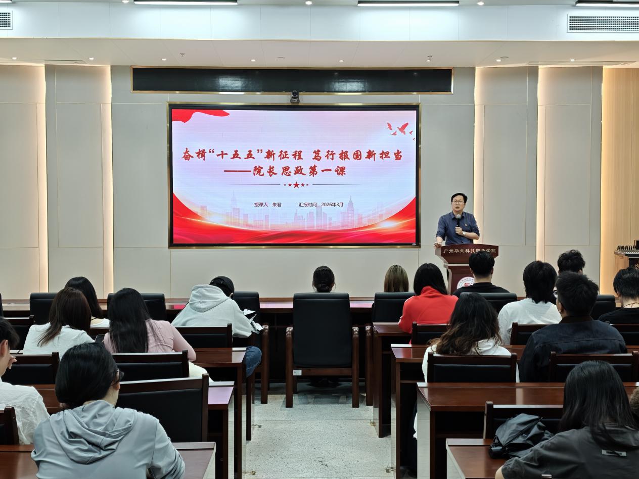 为深入学习贯彻党的二十届四中全会精神,引导青年学子认清时代方位、勇担青春使命。2026年3月17日,艺术与传媒学院朱君院长以“奋楫‘十五五’新征程,笃行报国新担当”为主题,为25级学前教育、体育教育专业的学生们带来了一堂思想深刻、内涵丰富、催人奋进的思政教育课。