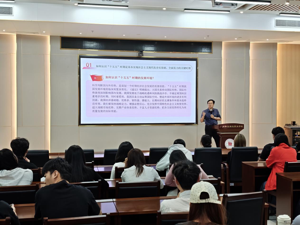 课堂上,朱君院长围绕“十五五”时期重要地位、发展环境与发展目标,深入解读“十五五”规划核心精神。他分享道,“十五五”时期是基本实现社会主义现代化夯实基础、全面发力的关键时期,在基本实现社会主义现代化进程中具有承前启后的重要地位,我国发展既面临挑战也具备诸多优势。