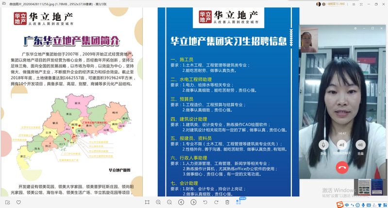 广州华立科技职业学院城建学院于2020年5月成功先后举办4场企业宣讲会。城建学院校外主任刘燕老师成功邀请了广州华立地产集团有限公司、广州市吉华勘测股份有限公司、佳邦建设集团有限公司、中咨工程建设监理有限公司等四家企业负责人在钉钉、微信上,为我校城建学院在校生做企业宣讲。宣讲会由刘燕老师主持,城建学院2018级学生踊跃参加了本月举行的企业宣讲会。
