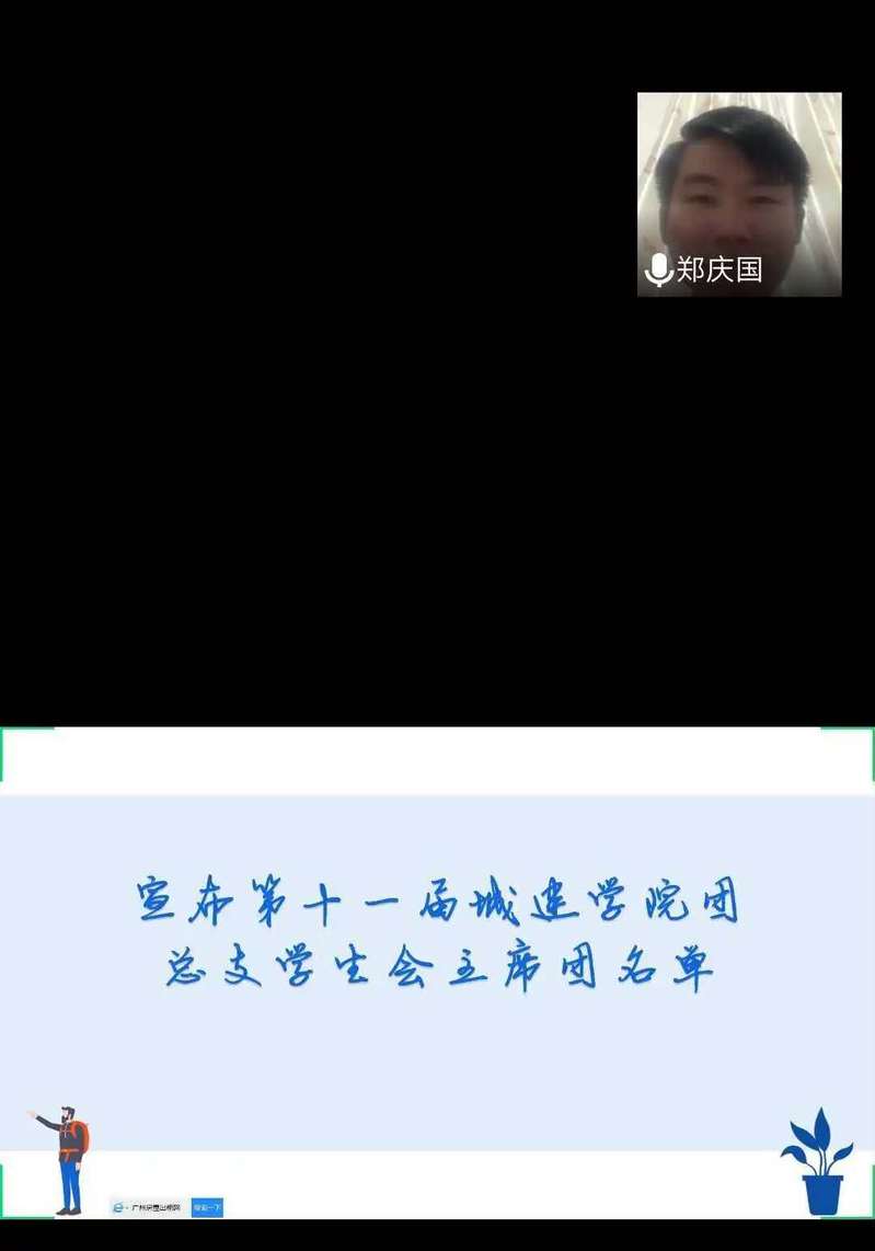 广州华立科技职业学院城建学院团总支学生会第十一届主席团第三轮竞选于2020年6月6日晚上7点30分通过腾讯视频会议线上举行。出席本次竞选大会的领导嘉宾有:城建学院办公室主任刘军根老师、城建学院学管主任林辉文老师、校团委副书记杨涛老师、国际经济与外语学院团总支书记陈权丰老师、管理学院团总支书记陈媛老师、艺术与传媒学院团总支书记郑梓杰老师、计算机信息工程学院团总支书记郭丽纯老师、会计学院团总支书记陈美欣老师、城建学院团总支书记郑庆国老师、城建学院18级辅导员廖佩宇老师、城建学院19级辅导员朱志豪老师、城建学院19级实习辅导员曾剑松老师、城建学院19级实习辅导员庄勇辉老师、城建学院办公室实习生詹科老师、第九届团总支学生会主席团师兄师姐、第十届团总支学生会主席团全体成员、以及各部门代表。