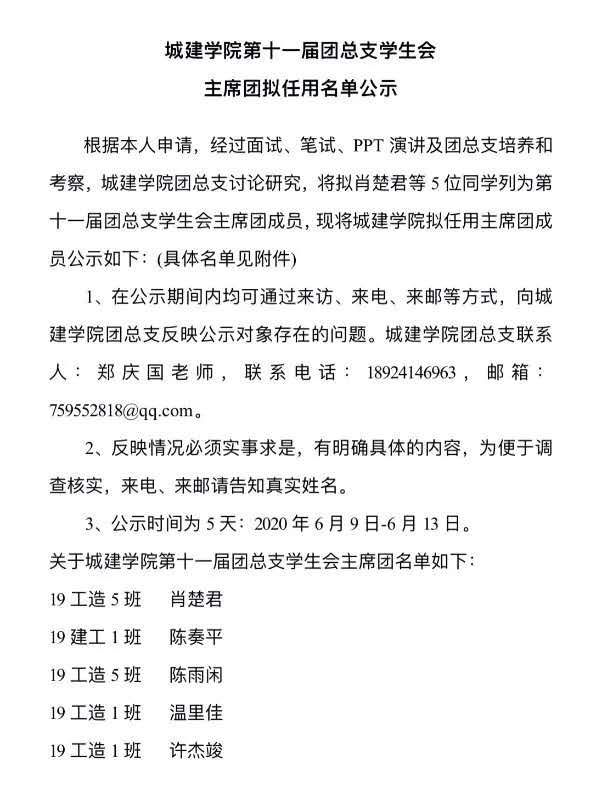 各位嘉宾们和各部门代表在问星卷线上投票,由主席团负责检票,在公正、公平、公开的前提下,学生会主席团最终名单已有结果。第十一届团总支学生会主席团的最终名单由城建学院团总支书记郑庆国老师宣布:由肖楚君、陈奏平,温里佳,陈雨闲,许杰竣五名候选人拟任城建学院第十一届团总支学生会主席团成员,并在学院公示五日。