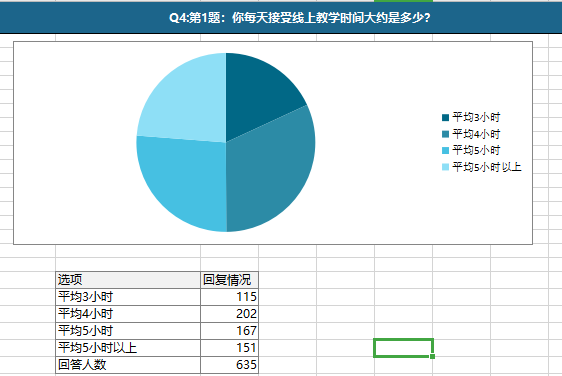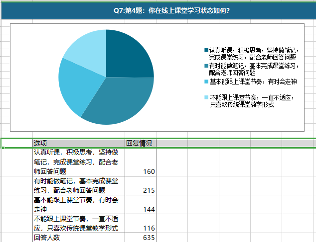 本次收回问卷635份,问卷显示,大约一半的同学每天会花5个小时以上的时间用于网课学习,学习主动性较好,能跟上老师的节奏,认真完成网络课程学习;学生认为大部分的老师都能认真进行线上教学,能及时对学生的问题进行答疑解惑,喜欢老师采用课堂直播与实时互动的形式进行,对大部分老师的教学比较满意,但是,也有学生反映前期上课只有电子版教材、一小部分老师网络平台使用操作不熟练,上课互动少等情况。