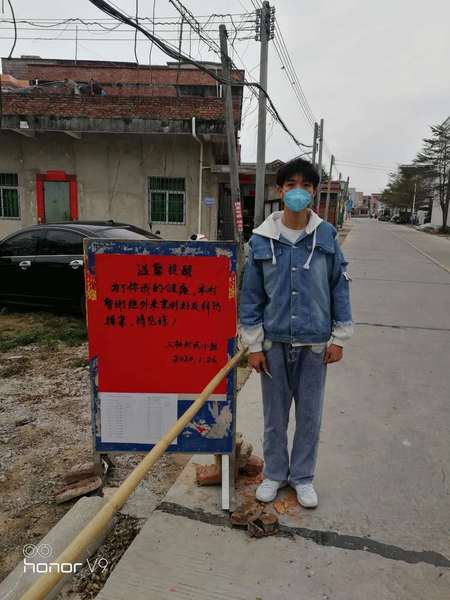 17工造3班陈锐锋,2月15日至16日,他在广东省汕头市澄海区东里村上岗战疫一线,负责人员登记行程、询问身体情况,通行人员测量体温的工作,他说:“只要我们同心协力,共同努力,共抗战役,很快打赢这场没有硝烟没有战火“疫”情防控攻坚战的。武汉加油!中国加油!”