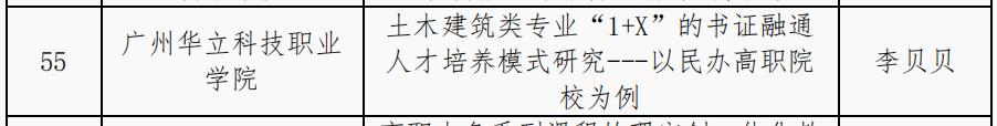 立项项目中,《土木建筑与水利类专业产教融合背景下创新创业机制研究》、《基于工匠精神的建筑工程技术专业课程思政实施路径研究与实践》、《湾区协同发展下对土木建筑类专业技能人才需求与培养的研究》作为一般项目立项。《土木建筑类专业“1+X”的书证融通人才培养模式研究---以民办高职院》作为青年教师教研项目立项。