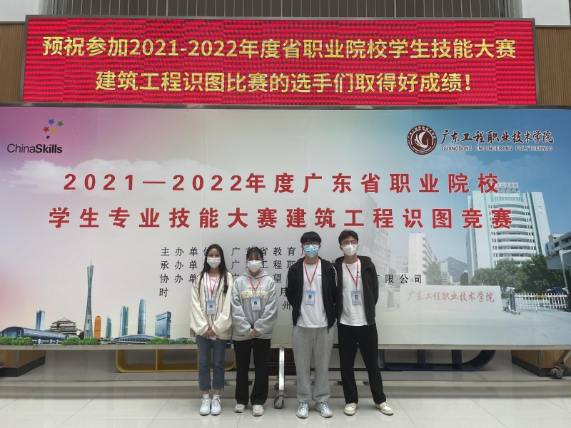 2022年1月5日至7日,2021-2022年度广东省职业院校技能大赛建筑工程识图赛项在广东工程职业技术学院举行。我校城建学院选派的由欧雪琴老师领队,李贝贝、欧雪琴、马芳、李丹老师指导的20工程造价专业李明浩、张思怡、龙汝、陈树凯四位同学组成的2支参赛代表队参加了比赛。在来自全省各高职院校的46个学校86支队伍中,经过激烈的角逐,李明浩、张思怡团队荣获三等奖。