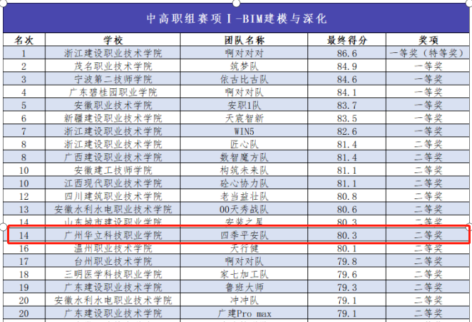由城建学院工程造价专业陈嘉伟、陆土泉、傅剑亮和建设工程监理专业的甘林峰同学组成的“四季平安队”,在城建学院李贝贝、欧雪琴老师的精心指导下,获得了本次大赛总决赛高职组“BIM 建模与深化设计”赛项“二等奖”,同时,我校获评本次比赛优秀组织奖。