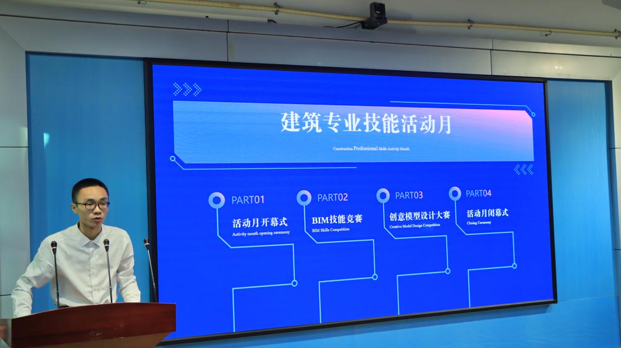 接着由本次活动月策划人建筑工程技术专业杨灿涛(校建筑协会)同学介绍了活动的安排,包括开幕式、BIM技能竞赛、创意模型设计大赛和闭幕式四个环节的时间、活动形式和注意事项,并为大家展示了学生的相关作品。