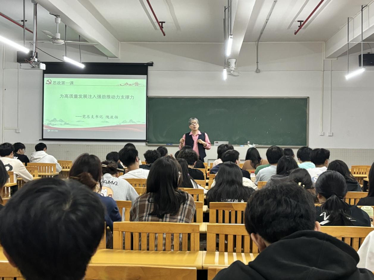 陈积光院长从培养高素质技术技能人才、优化调整学科专业、引育人才方面给学生们讲解“新质生产力”一词的时代内涵和意义,结合国家现在的发展需要,引导学生树立正确的三观,筑牢学生根基,将来为社会贡献一份自己的力量。