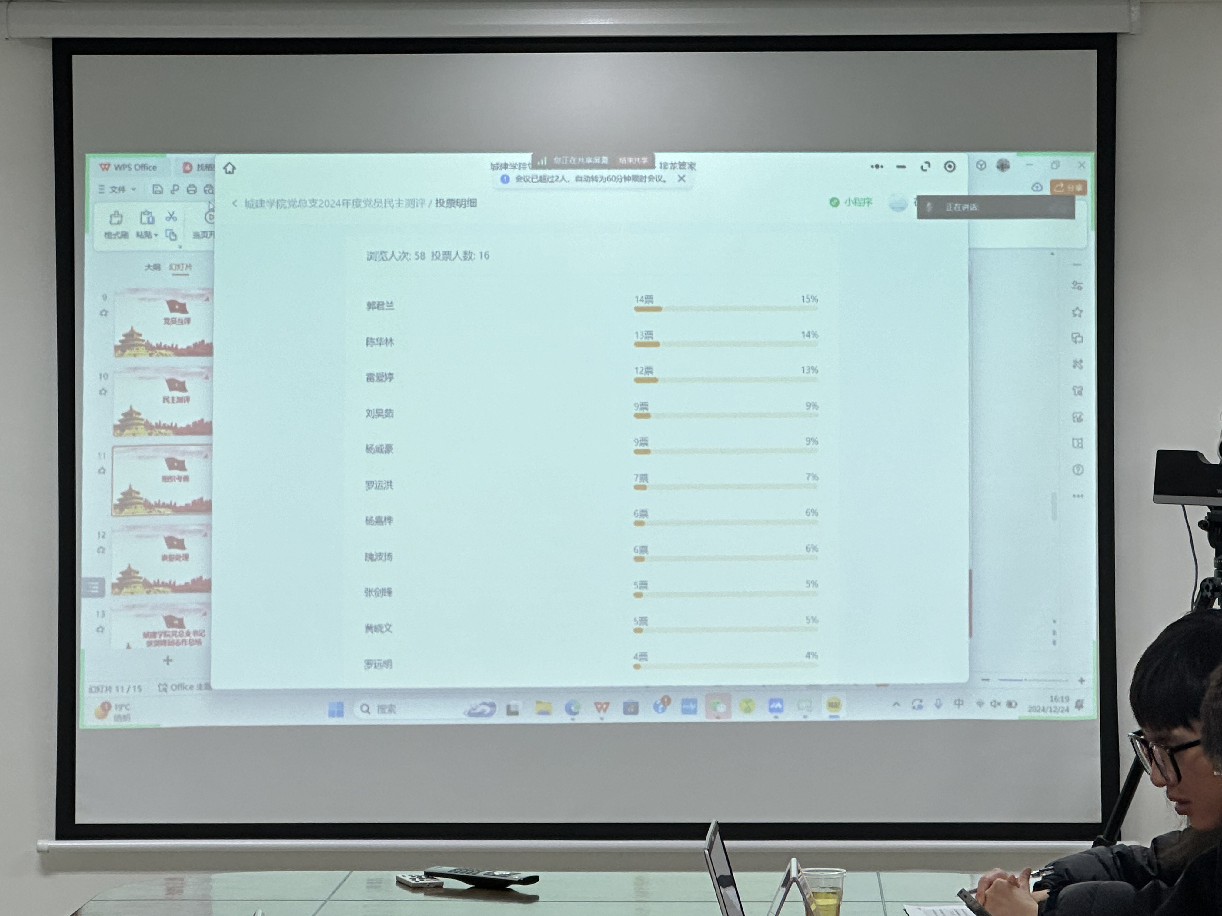 最后,由张剑锋同志宣布本年度民主测评的结果,城建学院党总支2024年度民主评议党员共有19名,评定等级分为“优秀”、“合格”、“基本合格”、“不合格”,评定为“优秀”的比例一般不超过党员总数的1/3,所以判定为优秀的有郭君兰同志等6名同志,其余13名同志为合格,无基本合格、不合格。
