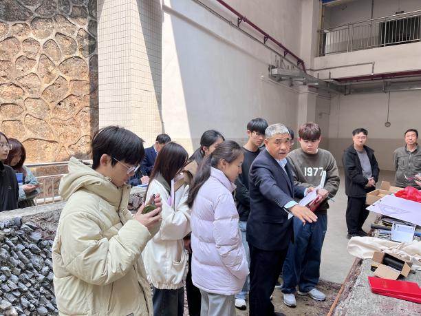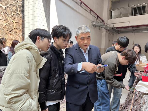 上课伊始,阎学欣教授带领观摩的教师、学生参观“四探”实训场,介绍了地质勘探中“四探”具体方法,即槽探、坑探、井探、钻探在找矿中的运用。在教学过程中,详细讲解了探槽编录的目的、意义、方法及相关规范要求,他指出,精准的探槽编录能够为后续的地质研究和工程建设提供关键依据,任何一个细节的疏忽都可能影响到整体的判断;随后,阎教授在现场进行了认真、细致的操作示范,从探槽的测量定位、地质现象的观察描述,到绘制编录图的步骤与要点,都一一进行了演示,并强调了操作过程中的注意事项。