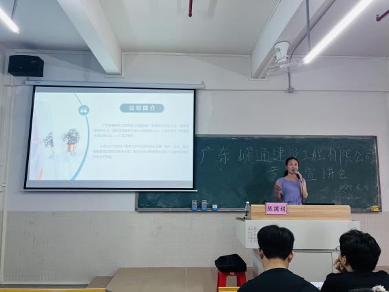 为搭建校企人才沟通合作桥梁,助力学生搭建与优质企业对接的平台,明确职业方向,顺利开启实习征程,2025 年 6 月 5 日,广东嵘通建设有限公司陈国娟主任走进华立职院城建学院,在云浮校区举办了一场精彩的专场宣讲会。作为一家在行业内颇具影响力的企业,嵘通建设已连续多年在城建学院开展进校讲座与招聘活动,双方保持着长期且稳定的合作关系。