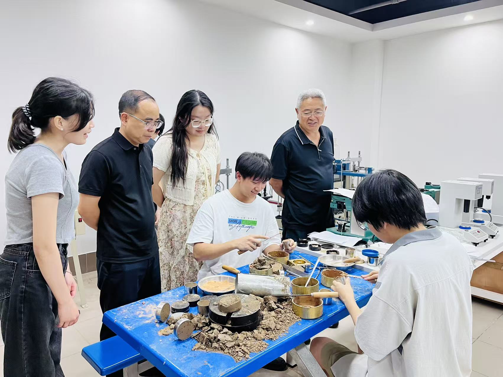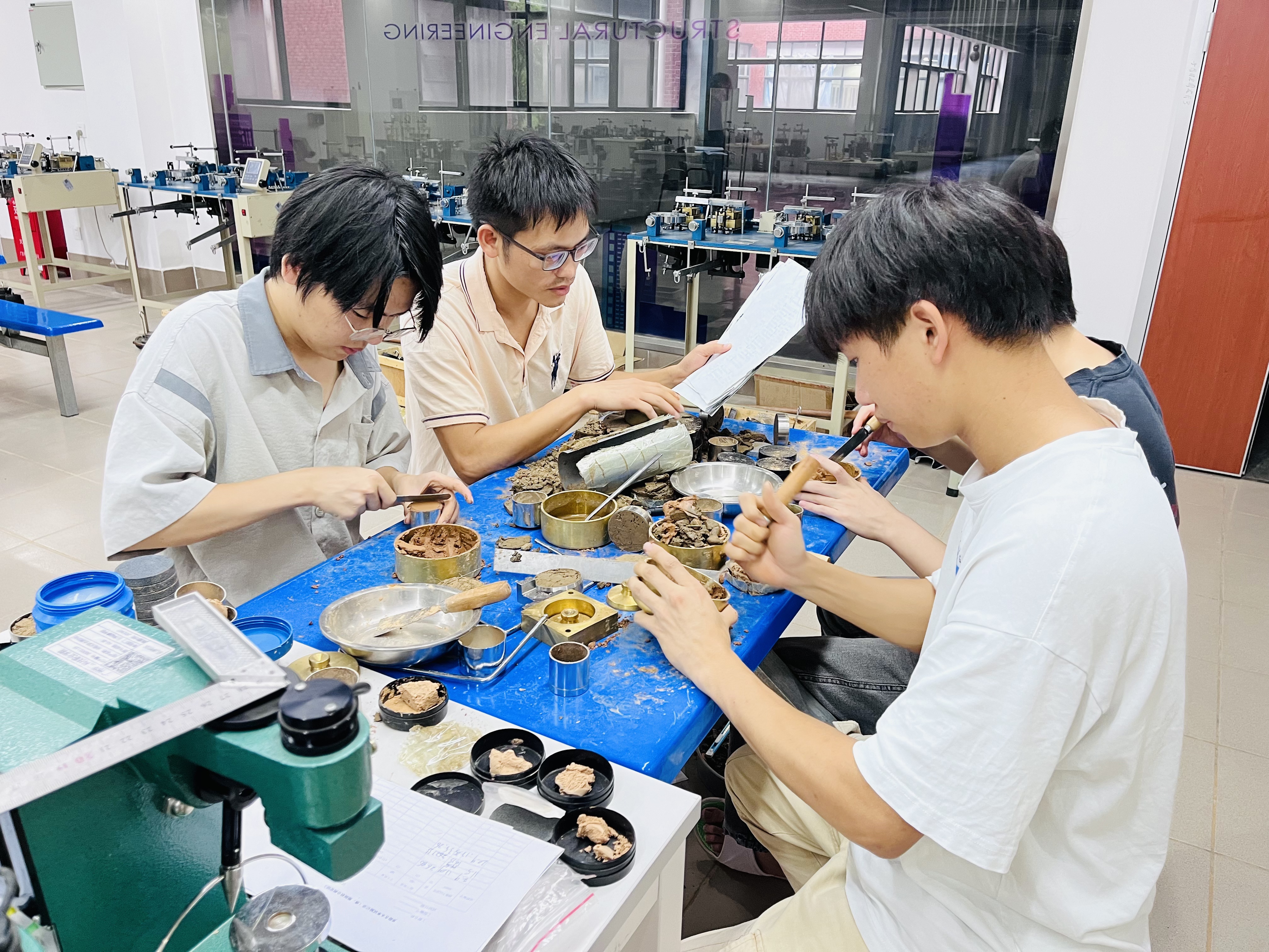 实践操作是本次竞赛的重要环节,也是参赛学子们的重点备赛方向。三位学生在两位老师的指导下,针对土工试验模块中的多个关键项目展开专项训练,涵盖土样开样、密度试验、含水率试验、界限含水率试验(液塑限联合测定法)、及数据处理等内容。这些试验均为地质工程勘察的核心环节,学生们认真对待每一次试验操作,从仪器设备的调试到样本的采集与处理,再到数据的记录与分析,每一个步骤都严谨细致,力求做到精益求精。