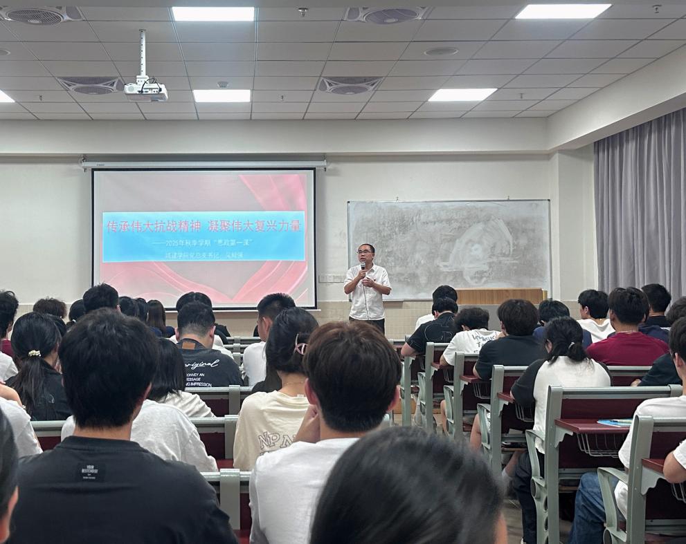 2025年10月14日,城建学院党总支书记吴毅强在第二教学楼408教室,为24级、25级各专业学生讲授以“传承伟大抗战精神 凝聚伟大复兴力量”为主题的“思政第一课”,引导青年学子从抗战历史中汲取精神力量,锚定民族复兴使命。
