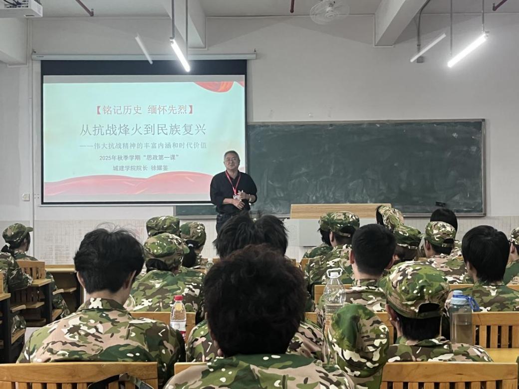 2025年10月28日,城建院院长徐耀鉴在第二教学楼305教室以“从抗战烽火到民族复兴”为主题,为25级新生讲授新学期“思政第一课”,带领新生学子回望抗战峥嵘岁月,在历史与精神的对话中锚定时代使命。