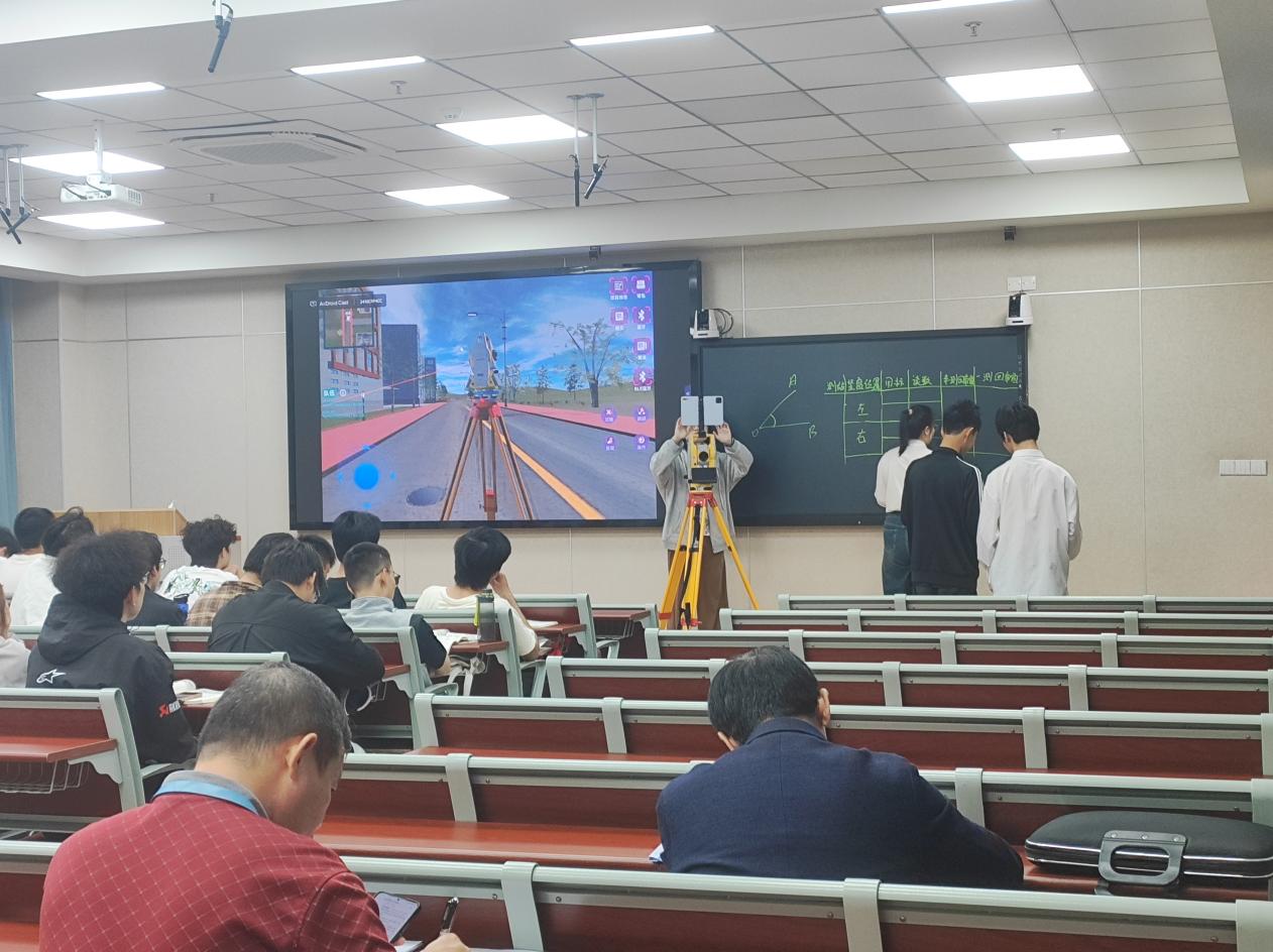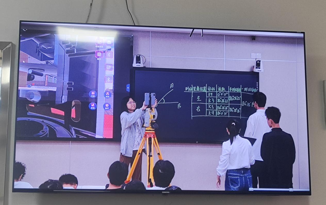 “测绘是工程建设的‘眼睛’,而全站仪就是这双眼睛的核心工具。”课程伊始,贾相苹老师简洁明了地介绍了仪器的发展历程、核心功能及在建筑、地质、交通等领域的应用场景。为打破传统课堂“重理论、轻实践”的局限,本次课程特别引入虚拟仿真系统——虚实一体云协同虚拟仿真平台,通过构建沉浸式测绘作业环境,学生们仿佛置身现场。教师结合虚拟仿真平台,将抽象的 “大地坐标系”“高程测量” 等理论知识转化为可视化的动态画面,原本晦涩的公式推导、原理阐释,通过与真实工程案例的结合,变得清晰易懂。现场学生不时举手提问,教师则借助交互屏幕实时标注、拆解关键环节,让理论学习不再 “纸上谈兵”。